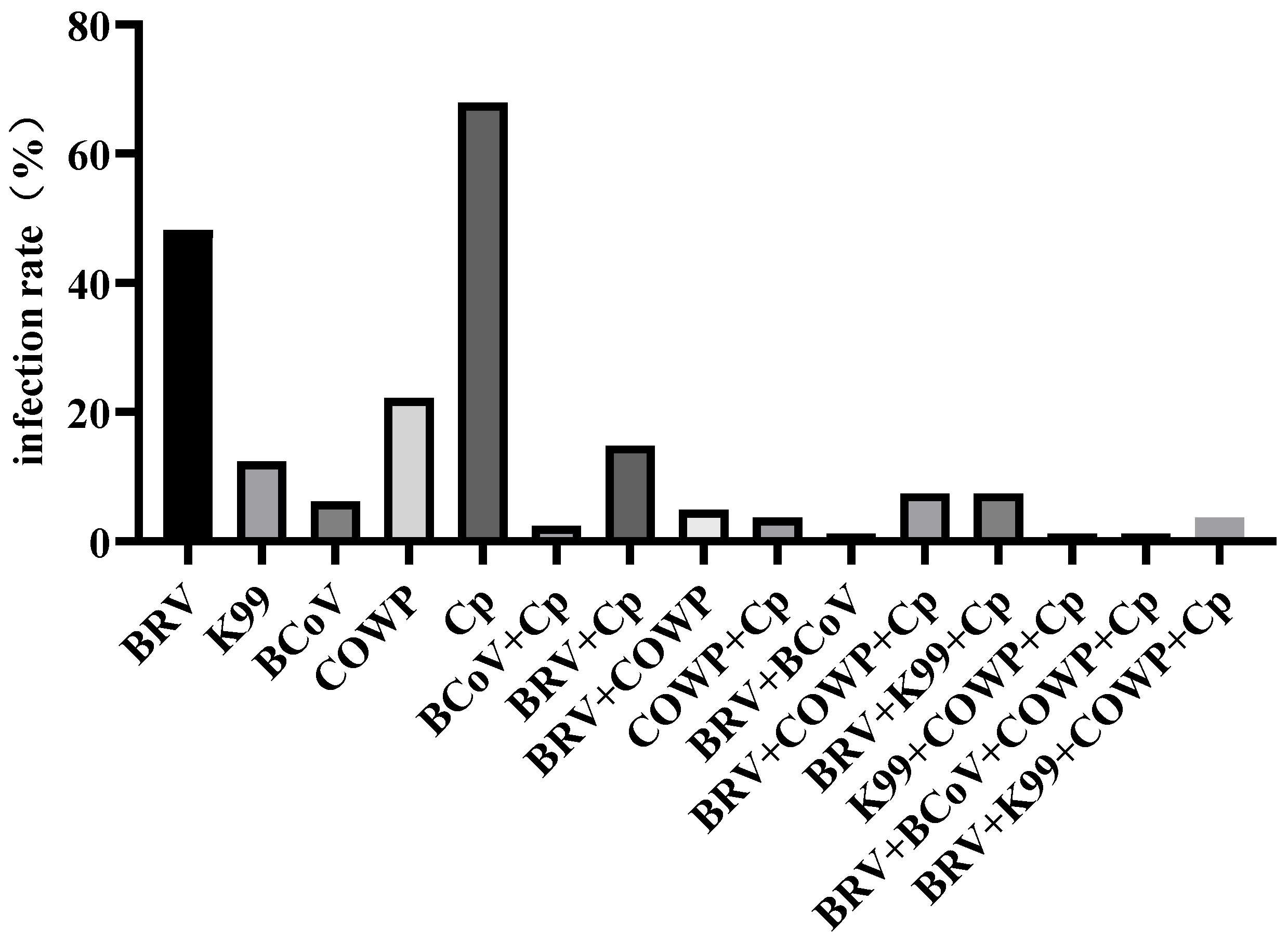 27]. Notably, 48.14% of calves were co-infected with two or more pathogens. Mixed infections not only significantly increase diarrhea frequency but also exacerbate intestinal dysbiosis, mucosal inflammation, and electrolyte loss, thereby increasing mortality and complicating treatment [