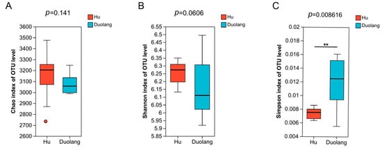 Alpha diversity indexes of ruminal microbiota of Hu sheep and Duolang sheep (n = 12). (A) Chao index of OTU level. (B) Shannon index of OTU level. (C) Simpson index of OTU level. ** p < 0.01.