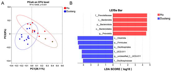 Beta diversity was calculated with Bray–Curtis dissimilarity and demonstrated by PCoA (Figure 3A). 482 out of the total 12,684 OTUs were significantly different between Hu and Duolang sheep (p < 0.05). Among the identified taxa from genus to phylum, 737 taxa were significantly different between Hu and Duolang sheep (p < 0.05). Among these taxa, 61 taxa had an LDA above 3, and 11 had an LDA score above 4 (Figure 3B).