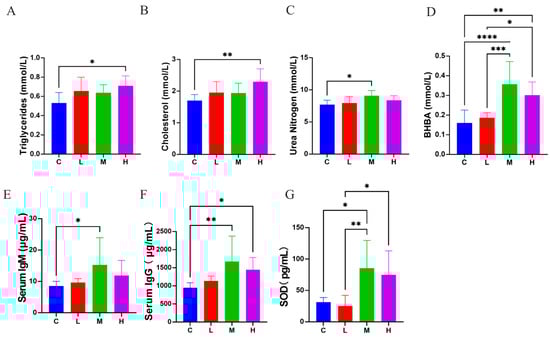 Serum biochemical parameters, including blood urea nitrogen (BUN), triglycerides (TG), and cholesterol (CHOL), were analyzed using an automated analyzer (VetScan HM5, Abaxis, Union City, CA, USA). Oxidative stress marker superoxide dismutase (SOD) was quantified using ELISA kits (Meimian, Yancheng, China). Additionally, β-hydroxybutyrate (BHB) level was measured with ELISA kits (Meimian, Yancheng, China). The serum concentrations of IgG and IgM were detected using enzyme-linked immunosorbent assay (ELISA) diagnostic kits (Huzhen Industrial Co., Ltd., Shanghai, China).