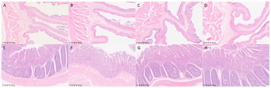 Histological analysis of rumen and ileum tissues (n = 3). Representative H&E-stained images of the rumen (A–D) and ileum (E–H). (A) Group C (Rumen); (B) Group L (Rumen); (C) Group M (Rumen); (D) Group H (Rumen). (E) Group C (Ileum); (F) Group L (Ileum); (G) Group M (Ileum); (H) Group H (Ileum). Magnification is indicated by the scale bar in each image.