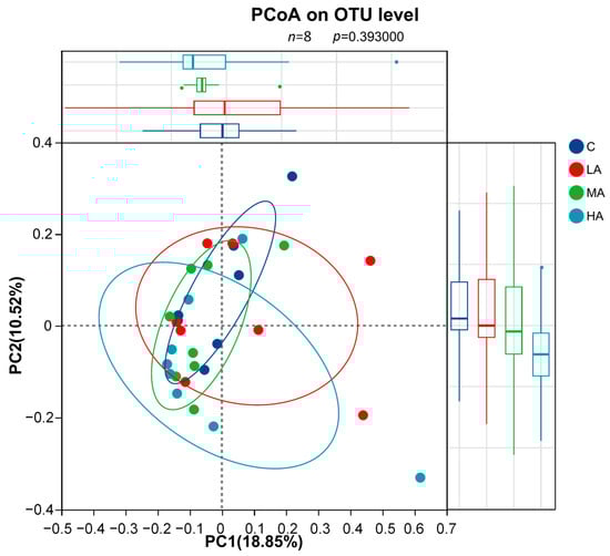A total of 1,414,753 high-quality sequences were obtained with an average of 45,637 sequences per sample (35,114–53,010 sequences). No significant differences were observed in the bacterial α-diversity indices (including the ACE, Chao1, Shannon, and Simpson indices) among four groups (p > 0.05). The PCoA at the OTU level with ANOSIM analysis showed no significant differences among groups (R = 0.0081, p = 0.393, 999 permutations; Figure 6). Consistently, PERMANOVA revealed no significant separation (F = 1.082, R2 = 0.107, p = 0.257, 999 permutations).