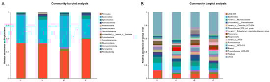 Gut microbiota community composition (n = 8). (A) Phylum-level microbial composition. (B) Genus-level microbial composition.