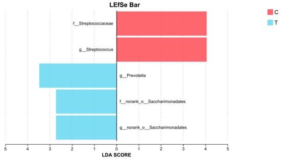 LEfSe analysis identified differentially abundant taxa between group C and three treatment groups (T), with an LDA score threshold of 2.5. The results revealed that several taxa were significantly enriched in the control group, including f_Streptococcaceae, and g_Streptococcus. In contrast, the treatment groups exhibited higher LDA scores for g_Prevotella, f_norank_o_Saccharimonadales, g_norank_o_Saccharimonadales (Figure 8).
