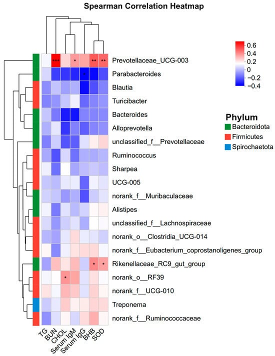 Spearman correlation heatmap between the top 20 abundant bacterial genera and host serum parameters. The color scale represents the correlation coefficient (T), with red indicating positive correlation and blue indicating negative correlation. * p < 0.05, ** p < 0.01, *** p < 0.001. TG: Triglycerides; BUN: Blood Urea Nitrogen; CHOL: Cholesterol; BHB: β-hydroxybutyrate; SOD: Superoxide dismutase.
