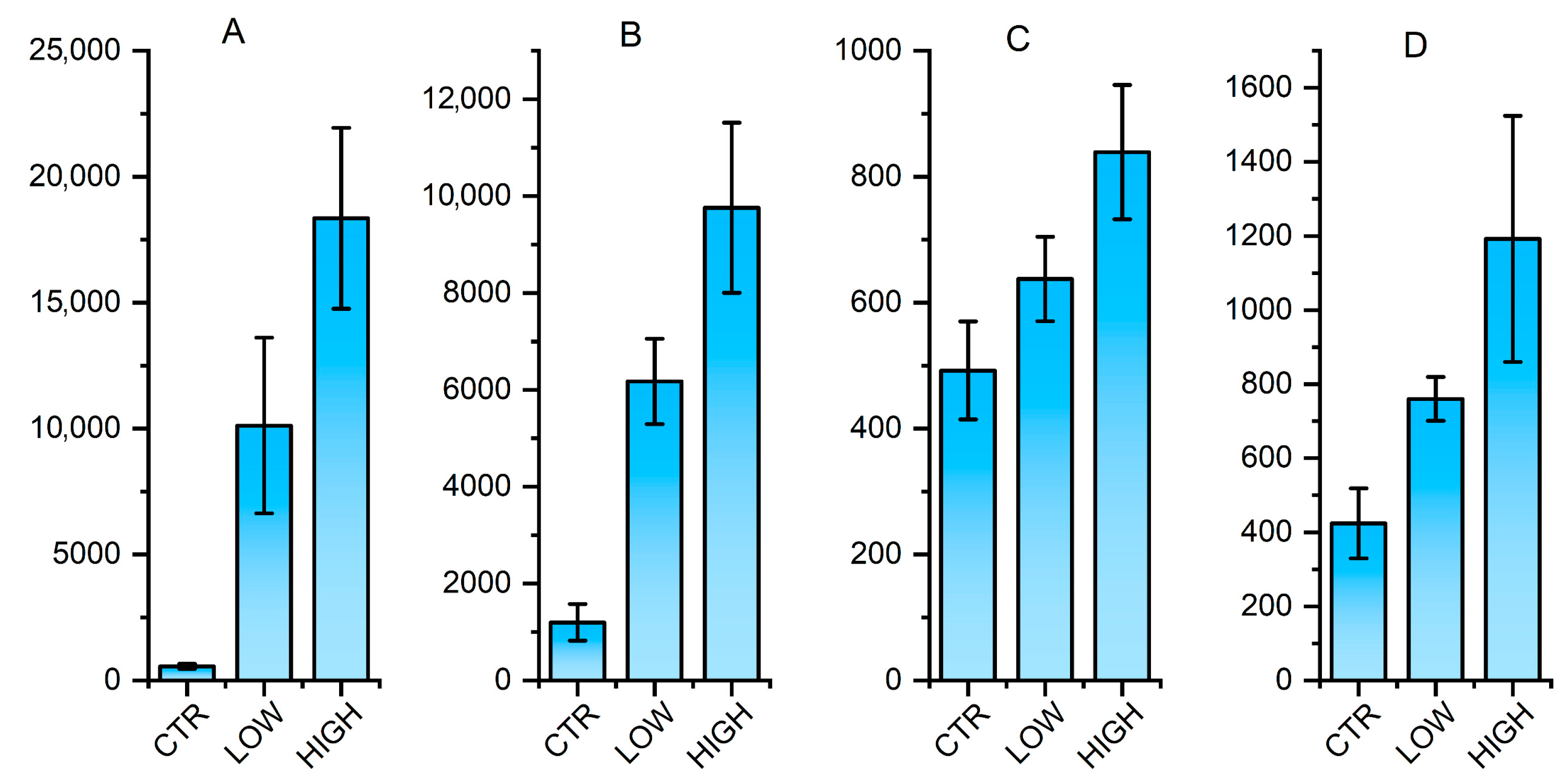 - Love, M.I.; Huber, W.; Anders, S. Moderated estimation of fold change and dispersion for RNA-seq data with DESeq2. Genome Biol. 2014, 15, 550. [Google Scholar] [CrossRef]