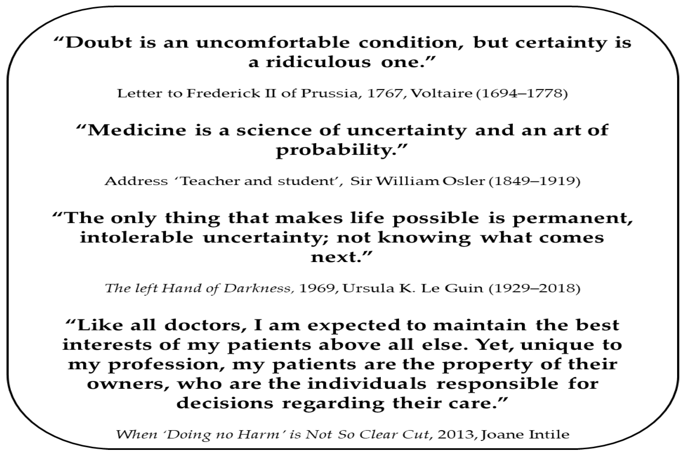 | Understanding that, despite all professional development, some level of uncertainty will be a regular occurrence in veterinary clinical practice | [21,22,37,83] | ||