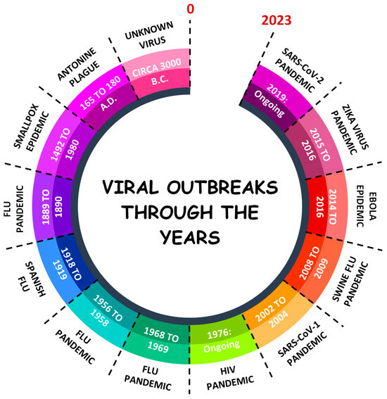 Ref. [35]: Timeline of history’s most notable viral pandemics and epidemics. Most major pandemics were attributed to mutated influenza viruses (H1N1, H2N2, and H3N2) that were thought to have originated in animal reservoirs and which subsequently spread to humans. The 2003 SARS-CoV-1 pandemic is regarded as the first pandemic of the 21st century and, similar to SARS-CoV-2, likely emerged from bats.