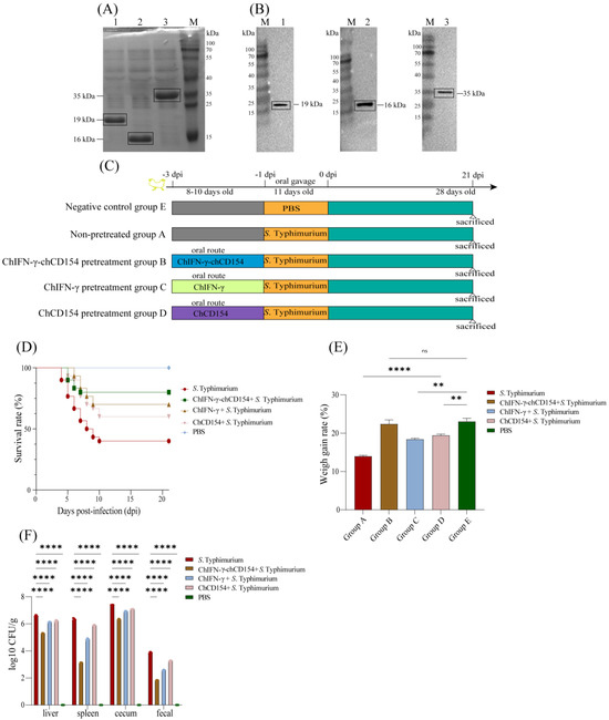 ChIFN-γ-chCD154 pretreatment alleviated S. Typhimurium infection in chickens. (A) SDS-PAGE and (B) Western blot analysis of chIFN-γ, chCD154, and chIFN-γ-chCD154. Lane M: protein molecular weight standard (The original images are listed in the Supplementary Materials); Lane 1: 19 kDa chIFN-γ protein; Lane 2: 16 kDa chIFN-γ-chCD154 protein; Lane 3: 35 kDa chCD154 protein. (C) Schematic illustration of animal experiments. (D) Survival rates. (E) The weight gain rates (%). The data are expressed as the mean ± SD (n = 3 per group). ** p < 0.01, **** p < 0.0001, and ns = not significant applies to the S. Typhimurium-infected groups pretreated with chIFN-γ, chCD154, or chIFN-γ-chCD154 compared with the control group. (F) Bacterial load in liver, spleen, cecum, and feces of chickens infected with S. Typhimurium. The data are the mean ± SD (n = 3 per group). **** p < 0.0001 are the groups of S. Typhimurium pretreated by chIFN-γ, chCD154, or chIFN-γ-chCD154 versus the infected control group pretreated only with PBS.