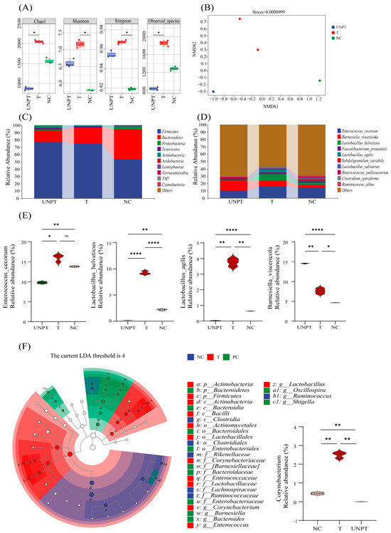 ChIFN-γ-chCD154 pretreatment alleviated intestinal damage in S. Typhimurium-infected chickens. (A) Alpha diversity indicators. (B) NMDS analysis of beta diversity in different groups (stress = 0.0000999). Relative abundance of bacterial phyla in cecal contents. (C) Relative abundance of bacterial genera in cecal contents (D). (E) Significance analysis of four different genera. (F) LEfSe analysis in different groups. The data are expressed as the mean ± SD (n = 3 per group), and a one-way ANOVA test was performed, followed by Tukey’s test. * p < 0.05, ** p < 0.01, **** p < 0.0001, ns = not significant.