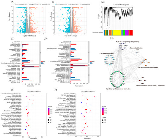 A total of 25,489 genes (Table S1) for 18 samples were used to build a WGCNA. The WGCNA analysis identified 40 distinct modules with a mergeCutHeight of 0.8 (Figure 4G, Table S1). Six signaling pathways significantly related to the immune system were screened by the KEGG analysis (Table S1), including the NOD-like receptor signaling pathway, cytokine–cytokine receptor interaction, the intestinal immune network for IgA production, the Toll-like receptor signaling pathway, the TNF signaling pathway, and Salmonella infection. A network analysis identified an interaction between the Toll-like receptor pathway and Salmonella infection via TLR4 and TLR2, the NOD-like receptor pathway and Salmonella infection via GBP1, and the TNF signaling pathway and Salmonella infection via IRF1 (Figure 4H).