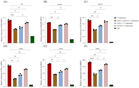 ChIFN-γ-chCD154 pretreatment suppressed the TLR4/Myd88/NF-kB pathway in the cecum of S. Typhimurium-infected chickens. The mRNA expression of (A) TLR4, (B) MyD88, (C) NF-kB, (D) TNF-α, (E) IL-1β, and (F) IL-6 in cecal tissues from S. Typhimurium-infected chickens. n = 3 per group. Data are expressed as the mean ± SD, and a one-way ANOVA test was performed, followed by Tukey’s test. * p < 0.05, ** p < 0.01, *** p < 0.001, **** p < 0.0001, ns = not significant.