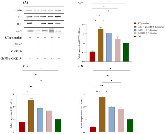 ChIFN-γ-chCD154 pretreatment promoted the IFN-induced JAK/STAT1/IRF1/GBP1 axis in the cecum of infected chickens. (A) Protein expression of STAT1, IRF-1, and GBP1. The mRNA expression of (B) STAT1, (C) IRF-1, and (D) GBP1 (n = 3 per group). Data are expressed as the mean ± SD, and a one-way ANOVA test was performed, followed by Tukey’s test. * p < 0.05, ** p < 0.01, *** p < 0.001, ns = not significant.