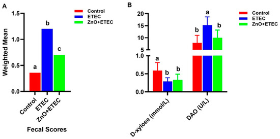 The effects of ZnO administration on the fecal scores and DAO activity of piglets infected with ETEC K88. (A) Effect of ZnO administration on fecal scores of ETEC K88-infected piglets. (B) Effect of ZnO administration on D-xylose content and DAO activity in ETEC K88-infected piglets. Data are shown as mean ± SD (n = 8), and mean values following different letters at the top of the a, b, and c plots signify statistically significant differences (p < 0.05).