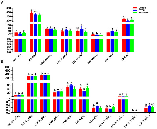 The effects of ZnO administration on hematological parameters and blood biochemical in ETEC K88-infected piglets. (A) Effect of ZnO administration on the plasma biochemical parameters in the ETEC K88-infected piglets. (B) Effect of ZnO administration on the blood hematological parameters of the ETEC K88-infected piglets. Data are shown as mean ± SD (n = 8), and mean values following different letters at the top of the a, b, and c plots signify statistically significant differences (p < 0.05).