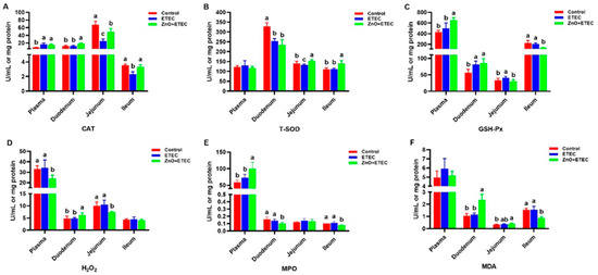 Compared with the control group, the activities of CAT in the ileum and jejunum, and the activity of T-SOD in the jejunum and duodenum were significantly decreased, but the activities of GSH-Px in the duodenum and jejunum and plasma CAT were significantly increased after ETEC K88 infection (Figure 4A–C). However the ZnO + ETEC group had higher (p < 0.05) CAT activity in the ileum, jejunum, and duodenum, higher (p < 0.05) T-SOD activity in the ileum and jejunum, higher (p < 0.05) plasma and duodenum GSH-Px activities, higher (p < 0.05) plasma MPO activity, the concentrations of H2O2 and MDA in the duodenum, whereas there was lower (p < 0.05) H2O2 concentration in the jejunum and plasma, lower (p < 0.05) MPO activity in the ileum and duodenum, lower (p < 0.05) MDA levels in the ileum, and a trend towards lower H2O2 concentrations in the ileum (p > 0.05) (Figure 4A–F) compared with the ETEC group.