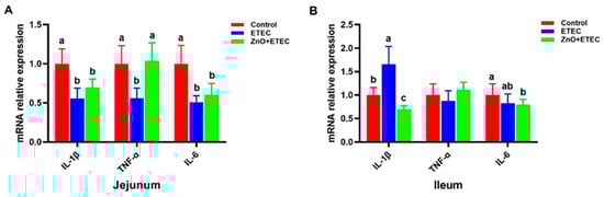 Compared with the control group, the mRNA levels of IL-6, TNF-α, and IL-1β in the jejunum were dramatically downregulated in the ETEC group (Figure 5A). The mRNA level of IL-1β was dramatically upregulated in the ileum after ETEC K88 infection (Figure 5B). However, ZnO administration significantly down-regulated the mRNA level of IL-1β in the ileum and significantly up-regulated the mRNA level of TNF-α in the jejunum (Figure 5A,B).