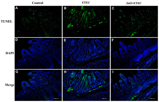 The effects of ZnO administration on the levels of apoptosis in the ileal epithelial cells of piglets infected with ETEC K88. (A,D,G) Control group; (B,E,H) ETEC group; (C,F,I) ZnO + ETEC group. TUNEL = terminal deoxynucleotidyl transferase dUTP nick end labeling; DAPI = 4,6-diamidino-2-phenylindole. Scale bar: 100 mm.