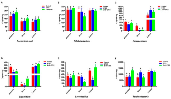 Compared to the control group, the numbers of Clostridium, Enterococcus, and Lactobacillus in the jejunum (Figure 7C,D,E), Enterococcus and Clostridium in the ileum (Figure 7C,D), and Lactobacillus in the cecum (Figure 7E) were remarkably reduced after ETEC K88 infection. While the number of Escherichia coli in the jejunum and cecum (Figure 7A), Enterococcus and Clostridium in the cecum (Figure 7C,D), and the total number of bacteria in the ileum (Figure 7F) remarkably increased. However, the ZnO administration significantly increased the counts of Lactobacillus, Bifidobacterium and Enterococcus as well as the total number of bacteria in the jejunum (Figure 7B,C,E,F), Escherichia coli and Clostridium in the ileum (Figure 7A,D), Clostridium and Lactobacillus in cecum (Figure 7D,E) in ZnO + ETEC group. In addition, the count of Bifidobacterium in the ileum in the ZnO + ETEC group was significantly reduced (Figure 7B). In the jejunum, the total counts of Bifidobacterium and bacteria were not significantly affected after ETEC K88 infection (Figure 7B), which ZnO administration significantly increased the total counts of Bifidobacterium and bacteria in the ZnO + ETEC group (Figure 7B). ZnO administration reduced the increase in the count of total bacteria in piglet ileum infected with ETEC K88 (Figure 7F).