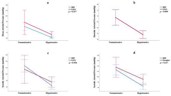 Estimated marginal mean and 95% confidence interval for mean arterial pressure (a), diastolic pressure (b), and systolic pressure (c,d) measured using linear deflection oscillometry (LDO) and Doppler compared with IBP measurements. No statistically significant differences were observed between values obtained by indirect methods (Doppler and LDO) and the direct method (IBP), according to GLM analysis with Bonferroni post-hoc testing (p > 0.05).