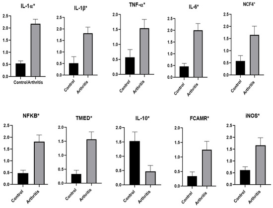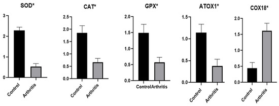 Figure 1 and Figure 2 showed the transcript profiles for the evaluated antioxidant and immunological indicators. The rams with arthritis showed significantly greater levels of gene expression for the genes IL-1α, IL-1β, IL-6, IL-10, TNFα, NCF4, NFKB, TMED, FCAMR, iNOS and COX18 than did the healthy rams. The expression of the SOD3, CAT, GPX and ATOX1 genes was significantly reduced in the rams with arthritis.