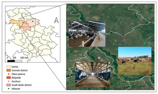 This research was conducted from 1 March to 31 August 2024, on dairy farms in the Vojvodina region (45.4° N and 20.2° E). Farms were selected based on accessibility, and traditional cow-rearing practices aligned with the planned study systems: the tie stall system (Kovilovo), loose system (Stara Pazova), and pasture-based system (Alibunar) (Figure 1). This study included 45 Holstein-Friesian cows (15 cows per housing system), aged 2 to 6 years. According to lactation, the examined dairy cows were divided into three age groups: age 2 (cows with 1st lactation), age 3–4 (cows with 2nd lactation), and age 5–6 (cows with 3rd lactation). Assessments of animal welfare and parasitological analyses were performed in three production phases: the late drying-off period (15–20 days before calving), clinical puerperium (28–30 days post-calving), and peak lactation (90 days post-calving). In the tie stall system, cows were kept in the stall with a length between 150 cm and 250 cm and a width between 90 cm and 175 cm. Straw bedding was used (3 kg/head/day or less) and replaced whenever needed. Cows do not have access to pasture, because they have been tied up their entire lives.
