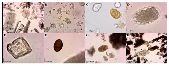 Parasitic elements detected in fecal samples: (A) Buxtonella sulcata cyst (100×); (B) Eimeria spp. oocysts (400×); (C) Eimeria bukidnonensis oocyst (400×); (D) Strongylidae egg (400×); (E) Moniezia spp. egg (400×); (F) Dicrocoelium dendrticum egg (400×); (G) Fasciola hepatica egg (100×); and (H) Paramphistomum spp. egg (100×).