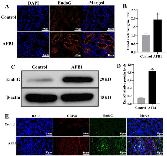 As shown in Figure 6, the immunofluorescence staining (Figure 6A), mRNA expression (Figure 6B), and protein expression (Figure 6C) results of EndoG confirmed that AFB1 exposure increased the expression of EndoG (p < 0.05). Moreover, the immunofluorescence double-staining results of EndoG and GRP78 show that AFB1 exposure increases the expression of GRP78 and the colocalization of EndoG and GRP78 (ER) (Figure 6E). These results suggest that AFB1 exposure induces EndoG expression and promotes EndoG translocation to the ER and binds to GRP78 in donkey kidneys.