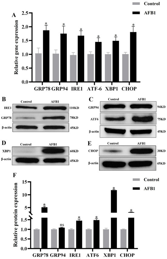ER stress-related mRNA and protein expression. (A) mRNA expression; (B–E) Western blot results; (F) protein expression, “*” denotes a significant difference compared to the control group (p < 0.05); “ns” in-dicates no significant difference compared to the control group (p > 0.05).