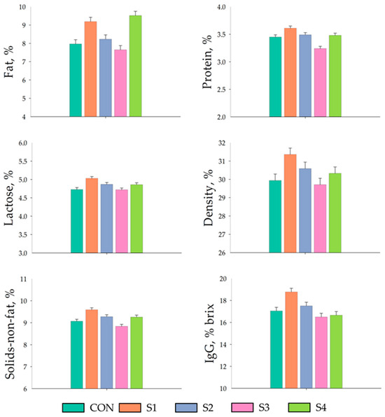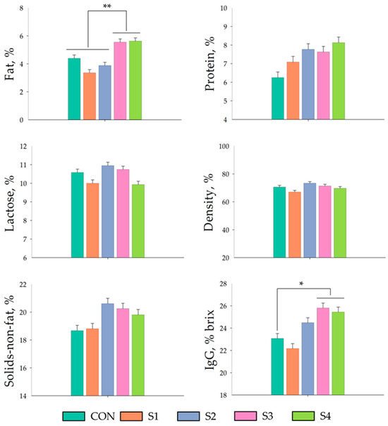 Effect of miMCFA, lignocellulose, and HKL137 supplementation on the nutritional composition of sow colostrum and mature milk are displayed in Figure 1 and Figure 2, respectively. Fat content in colostrum was significantly increased in the S3 and S4 group (p < 0.01) than those of CON group. Additionally, IgG levels, measured using the Brix percentage, were significantly greater in the S3 and S4 groups compared to CON groups (p < 0.05). However, there were no differences in terms of protein, lactose, density, and solids-non-fat content in colostrum. By day 7 of lactation, the mature milk from all groups exhibited no significant variations in fat, protein, lactose, density, IgG levels, or solids-non-fat content.