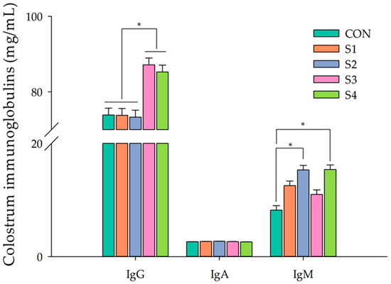 The effect of miMCFA, lignocellulose, and HKL137 supplementation on the immunoglobulins alteration of sow colostrum is shown in Figure 3. The S3 and S4 groups demonstrated markedly elevated IgG levels compared to the CON group and other supplementation groups (p < 0.05). Likewise, IgM levels were notably higher in the S2 and S4 groups compared to the CON group and other treatments (p < 0.05). In contrast, IgA levels in sow colostrum showed no significant differences across the groups (p > 0.05).