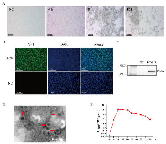 Identification of FCV in CRFK cells. (A) Cytopathic effect (CPE) of CRFK cells infected with FCV. (B) Immunofluorescence detection results 24 h after inoculation. Scale bar = 275 μm. (C) Western blot analysis of total cell lysates from virus-infected cells using anti-FCV VP1 polyclonal antibodies. (D) Electron micrograph of FCV virions (arrow heads) in cell culture media of infected CRFK cells. Scale bar = 100 nm. (E) One-step growth curve analysis of CRFK cells infected with FCV023 strains over 36 h; measurement at each time point was conducted in triplicate, and each experiment was set with three parallel groups. Average value was taken as TCID50 of virus. (Figure S1).