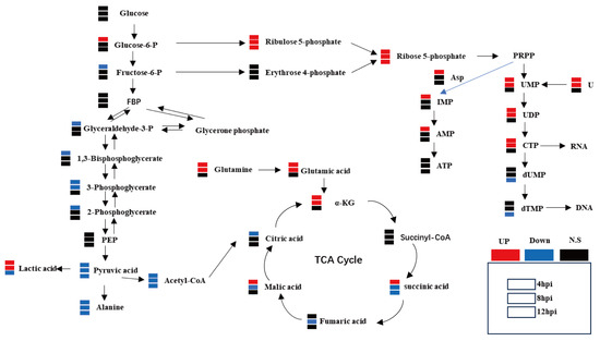 FCV023 infection remodels the central carbon metabolism in CRFK cells. The abundance changes in major intermediate metabolites in the central carbon metabolism of CRFK cells during FCV023 infection.