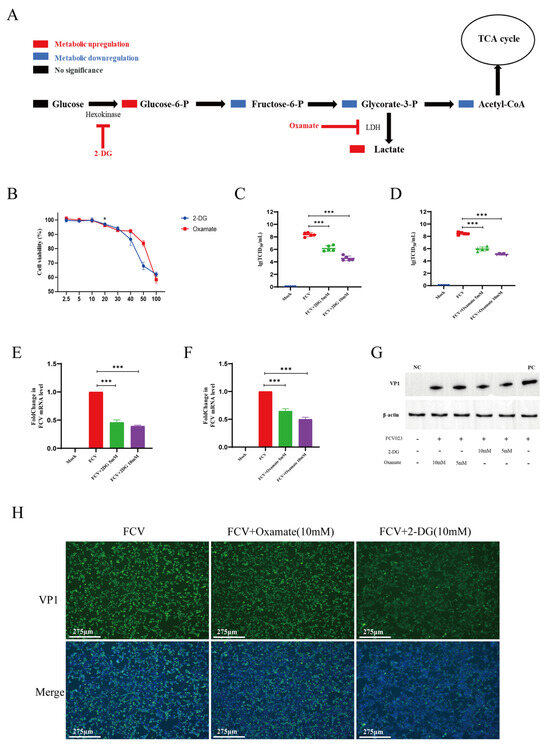 The inhibition of glycolysis inhibits the replication of FCV. (A) A schematic diagram of the functional targets of glycolytic pathway inhibitor drugs (2−DG, Sodium Oxamate) used in this study. (B) The impacts of different final concentrations of inhibitory drugs on the viability of CRFK cells after 8 h of treatment. (C,D) FCV023 infects CRFK cells at an MOI of 1 and is incubated in the presence or absence of glycolytic inhibitors, with viral titers being determined after 8 h. (E,F) FCV023 infects CRFK cells at an MOI of 1, and the intracellular mRNA levels of the FCV VP1 gene are analyzed by q−PCR after incubation in the presence or absence of glycolytic inhibitors for 8 h post-infection. (G,H) FCV023 infects CRFK cells at an MOI of 1 and is incubated in the presence or absence of glycolytic inhibitors, with the expression of FCV VP1 protein being analyzed by Western blotting after 8 h of infection. p < 0.05 was considered as statistically significant, * p < 0.05, *** p < 0.01. (Figure S2).