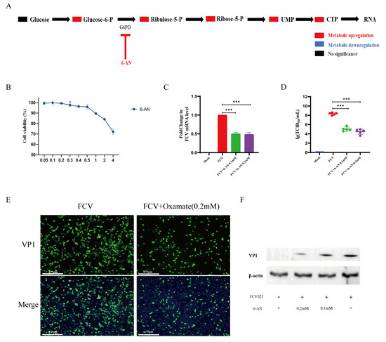 (A) A schematic diagram of the target sites of the PPP inhibitor 6-AN. (B) Changes in the viability of CRFK cells after treatment with 6-AN for 8 h. (C) The impact of 6-AN treatment on viral genome replication in FCV-infected CRFK cells (MOI = 1). (D) The impact of 6-AN treatment on viral titers in cells infected with FCV023 (MOI = 1). (E,F) FCV023 infects CRFK cells at an MOI of 1 and is incubated in the presence or absence of 6-AN, with the expression of FCV VP1 protein being analyzed by Western blotting after 8 h of infection. p < 0.05 was considered as statistically significant, * p < 0.05, *** p < 0.01. (Figure S3).