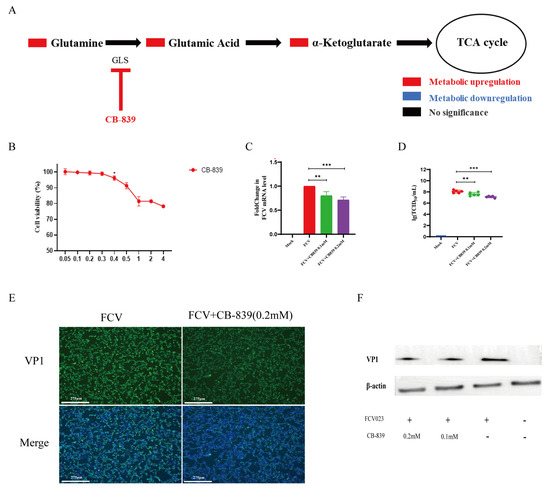(A) A schematic diagram of the mechanism by which CB-839 inhibits glutamine metabolism. (B) Fluctuations in CRFK cell viability (incubation with CB-839 for 8 h). (C,D) The impact of treatment with 0.2 mM of CB-839 on viral genome replication and the release of infectious viral particles. (E,F) The effect of glutamine metabolism inhibition on the expression of FCV capsid proteins. p < 0.05 was considered as statistically significant, * p < 0.05, ** p < 0.01, *** p < 0.01. (Figure S4).