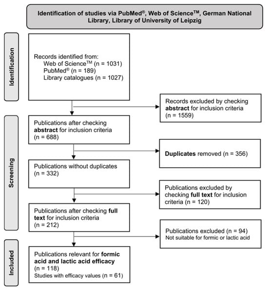 This systematic review of the literature pertaining to lactic and formic acid treatment was conducted according to the PRISMA 2020 guidelines [24]. As reported in [3] for oxalic acid, original peer-reviewed articles were identified from a search of databases (PubMed® and Web of ScienceTM) and the catalogs of the German National Library and the Library of the University of Leipzig.