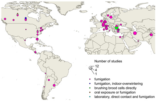 A total of 161 individual efficacy values resulting from treatment with formic acid were found in 55 sources. The values resulted from field trials (n = 140), laboratory trials (n = 9), or reviews and theoretical treatment concepts (n = 12), using fumigation, fumigation combined with overwintering indoors, brushing brood cells directly, and oral and direct exposure as application methods. The geographic distribution of these studies is shown in Figure 3.