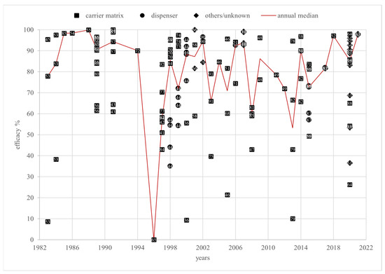 Field trials are the most relevant for practical use and are, therefore, the only ones discussed in this review. The 140 individual efficacy values of the field trials varied from 0% [65] to 100% [63,66] between 1983 [45,53] and 2021 [62]. These values were reported by only fifty-five sources, as some of them included more than one trial. A total of 94 (67.1%) and 54 (38.6%) efficacy values exceed 70% and 90%, respectively. Out of 32 annual medians over a 38-year period, 20 years were below 90%, but only 5 years were below 70% efficacy (Figure 4). The efficacy values were measured in 25 countries. The efficacy values originate from 9 broodless colonies and 77 colonies with brood. The remaining 54 had an unknown brood status.