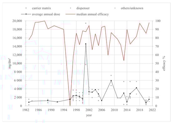 The annual average dosages over all three pharmaceutical forms range from 758 mg/dm in 2020 to 14,571 mg/dm in 2001. All reported doses in 2001, with the pronounced maximum, belong to the “carrier matrix” category. Figure 5 shows two more peaks of annual average doses after 2001: in 2009 with 5952 mg/dm and in 2017 with 4238 mg/dm. Only two doses can be calculated for 2009, both from the “carrier matrix” group using Mite-Away Quick StripsTM. The annual average dose in 2017 consists of two doses from the “dispenser” category. In most years, the average dose remains below 4000 mg/dm; 70.8% of the annual average doses fall between 400 mg/dm and 3000 mg/dm.
