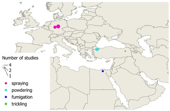 Only thirteen individual efficacy values of lactic acid were found in six literature sources. Some reported more than one trial setting. All were conducted as field trials. Spraying (n = 7) [93,94,95], fumigation (n = 2) [43], powdering (n = 3) [46], and trickling (n = 1) [96] were used as application methods. The studies took place in only four countries, as shown in Figure 6.