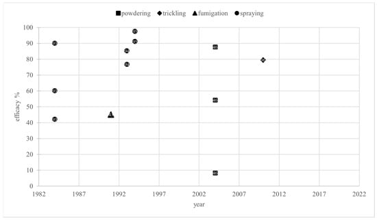 All reported efficacy values reported in 2008 were less than 70% and belong to the carrier matrix category. The specific hive type or volume used in the studies was not reported. Mahmood et al. used 13 g of formic acid by administering 20 g of 65% formic acid in a short-term treatment repeated three times [83] instead of the recommended 24 g of formic acid for each short-term treatment [5]. In addition, the carrier matrix was—ineffectively, as explained above—placed below the hive. Thus, the resulting efficacy of 59% must be attributed to insufficient acid levels in the hive air. A four-time treatment with 12 g of formic acid, also only half of the approved dose, achieved 63% efficacy in [81]. The low efficacies in [81,83] were clearly the consequences of low doses and carrier matrix misplacement. A single short-term treatment with 37.5 g of formic acid for 17 h described in [47] reduced mite infestation by 43% and 60%. Considering that four or five repetitions for a short-term treatment are recommended in [5], a single treatment cannot be expected to be sufficiently effective. Overall, the annual median efficacy value of 59.5% in 2008 was caused by insufficient doses or inadequate treatment and does not indicate the development of resistance.