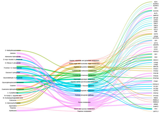 3.4. Combined Analysis of Transcriptomics and Metabolomics