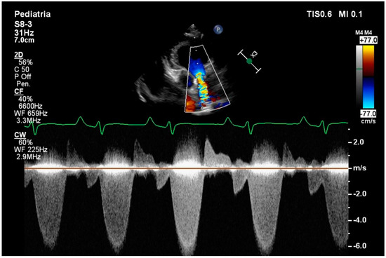 The diagnosis of PVS was established when a mild, moderate, or severe narrowing of the pulmonary valve or of the RV outflow tract had been identified. This anomaly determines the acceleration of the pulmonary antegrade flow and increases the gradient across the pulmonary valve [4]. The evaluation of the RV outflow tract and of the pulmonary valve was obtained from the right parasternal short axis view and left parasternal short axis view [19]. With these projections, measurements of the diameter of the pulmonary annulus were also carried out, necessary to classify the type of stenosis distinguishing type A, type B, and hourglass morphology [4]. The M-mode measurements were obtained from the two-dimensional images of the largest transversal diameter of the LV on the right parasternal short axis view, at the level between papillary muscles and the mitral valve. In this projection, the free wall thickness of the right ventricle at the end of diastole (RVFWd) was measured at the level of the midventricle, excluding the pericardium and including the endocardium, as previously described [20]. The RVFWd was indexed by body weight (BW; iRVFWd = cm/kg0.250). The TAPSE measurement was performed through the apical 4-chamber view, applying the M mode recordings of the lateral aspect of the tricuspid valve annulus [21]; also, this measure was indexed to BW using the previously published scaling exponent (iTAPSE in mm/kg0.297) [21]. The Doppler study of pulmonary antegrade flow was performed both with the right parasternal short axis projection and with the left parasternal short axis view [19]. In each patient, the mean and the peak velocity of the antegrade pulmonary flow were measured, and the transvalvular gradient was calculated. This parameter is used to classify the severity of the pathology. Through this Doppler study, it was also possible to identify the presence or absence of the EDFF. To be considered a restrictive condition, EDFF must be present in at least three consecutive beats [18] (Figure 1).