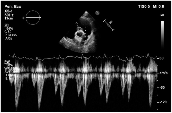 The diagnosis of PVS was established when a mild, moderate, or severe narrowing of the pulmonary valve or of the RV outflow tract had been identified. This anomaly determines the acceleration of the pulmonary antegrade flow and increases the gradient across the pulmonary valve [4]. The evaluation of the RV outflow tract and of the pulmonary valve was obtained from the right parasternal short axis view and left parasternal short axis view [19]. With these projections, measurements of the diameter of the pulmonary annulus were also carried out, necessary to classify the type of stenosis distinguishing type A, type B, and hourglass morphology [4]. The M-mode measurements were obtained from the two-dimensional images of the largest transversal diameter of the LV on the right parasternal short axis view, at the level between papillary muscles and the mitral valve. In this projection, the free wall thickness of the right ventricle at the end of diastole (RVFWd) was measured at the level of the midventricle, excluding the pericardium and including the endocardium, as previously described [20]. The RVFWd was indexed by body weight (BW; iRVFWd = cm/kg0.250). The TAPSE measurement was performed through the apical 4-chamber view, applying the M mode recordings of the lateral aspect of the tricuspid valve annulus [21]; also, this measure was indexed to BW using the previously published scaling exponent (iTAPSE in mm/kg0.297) [21]. The Doppler study of pulmonary antegrade flow was performed both with the right parasternal short axis projection and with the left parasternal short axis view [19]. In each patient, the mean and the peak velocity of the antegrade pulmonary flow were measured, and the transvalvular gradient was calculated. This parameter is used to classify the severity of the pathology. Through this Doppler study, it was also possible to identify the presence or absence of the EDFF. To be considered a restrictive condition, EDFF must be present in at least three consecutive beats [18] (Figure 1).