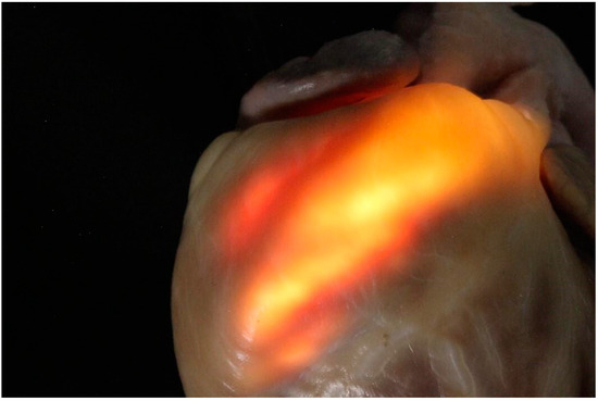An anatomical pathological study of the right outflow tract of the same patient as in Figure 2. Translucency highlights the thinning of the wall linked to the arrhythmogenic cardiomyopathy.