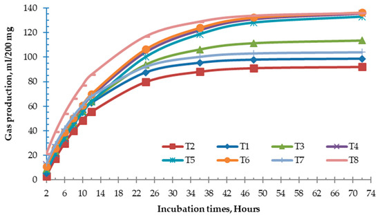 Three replicates of gas cumulative profile of rumen fluid treated for different incubation times: T1 = YC1, T2 = YC2, T3 = YC3, and T7 = YC0 with 10% of fermented fluid; T4 = YC1, T5 = YC2, T6 = YC3, and T8 = YC0 with 20% of fermented fluid.