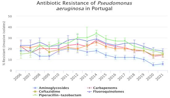 Resistance to PA in Portugal gradually increased until around 2014–2016, after which there has been a steady decrease in resistance levels (Figure 3). Interestingly, data from the European Medicines Agency (EMA) indicated that antibiotic sales in Portugal fluctuated during this period, peaking in 2016 []. The veterinary sales percentage ranged from 70% in 2011 to 55% in 2021. Among the antibiotics, fluoroquinolones and piperacillin-tazobactam showed the highest levels of resistance by PA in Portugal. Since 2011, the EMA has reported a significant overall decrease of 51.5% in annual antibiotics sales, including a 25% reduction in third- and fourth-generation cephalosporins, a 36.9% decline in fluoroquinolone sales, and a remarkable 76.5% reduction in polymyxin sales [].