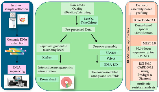 A workflow applied to perform an analysis of the sequencing reads is depicted in Figure 1. The multistep workflow presented here allows for (i) pathogen detection by de novo assembly based species identification and metagenomics; (ii) MLST and antibiotic resistant analysis using BLAST-based approaches; and (iii) reference-guided assembly to generate a consensus sequence (Figure 1).