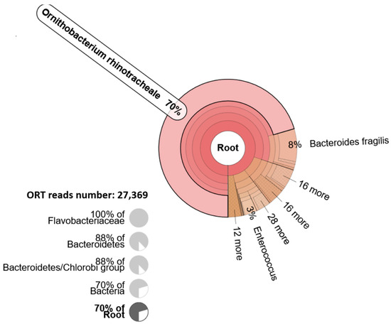 For species identification, we used de novo-assembled contigs as an input for KmerFinder 3.1 and pre-processed sequencing reads for Kraken data analysis. Both platforms identified Ornithobacterium rhinotracheale (ORT) in the sample. Detailed statistics of species identification using KmerFinder 3.1 are shown in Table 2, whereas the distribution of the reads classified by Kraken for clinical samples is shown in Figure 2. Out of 141,868 paired reads, 38,895 reads were classified into the “Bacteria” domain by Kraken, and 70% of reads were classified as ORT (27,369 sequencing reads).
